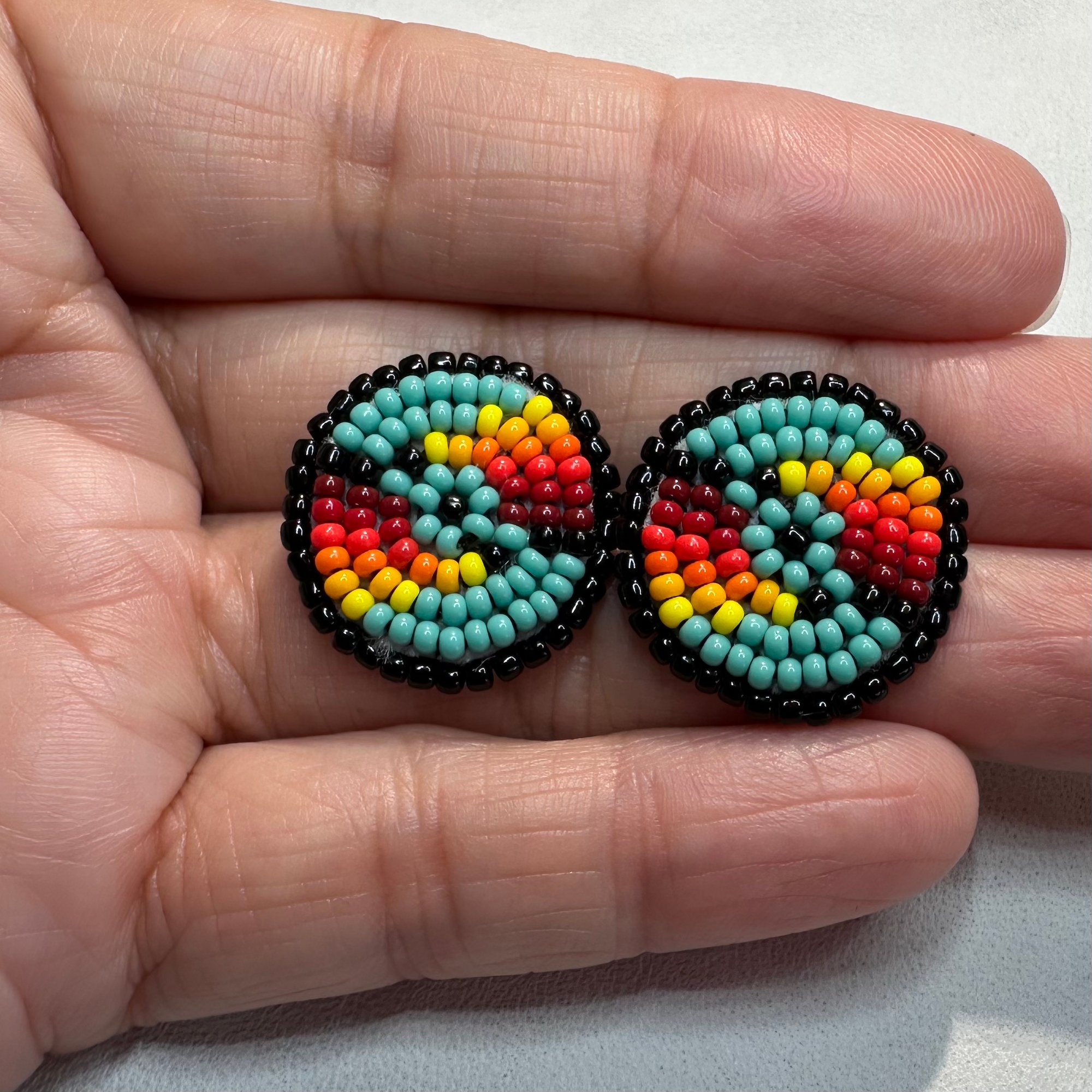 ❗️Was $12, Now $10❗️These mini earrings are perfect for the minimalist. They measure at just under 1 inch and are backed with a black faux leather fabric on silver posts. “Fire Colors” are traditional colors that respresent Indigenous Tribes. Created with love of style and culture at top quality, make a Bold statement with these mini beaded earrings!