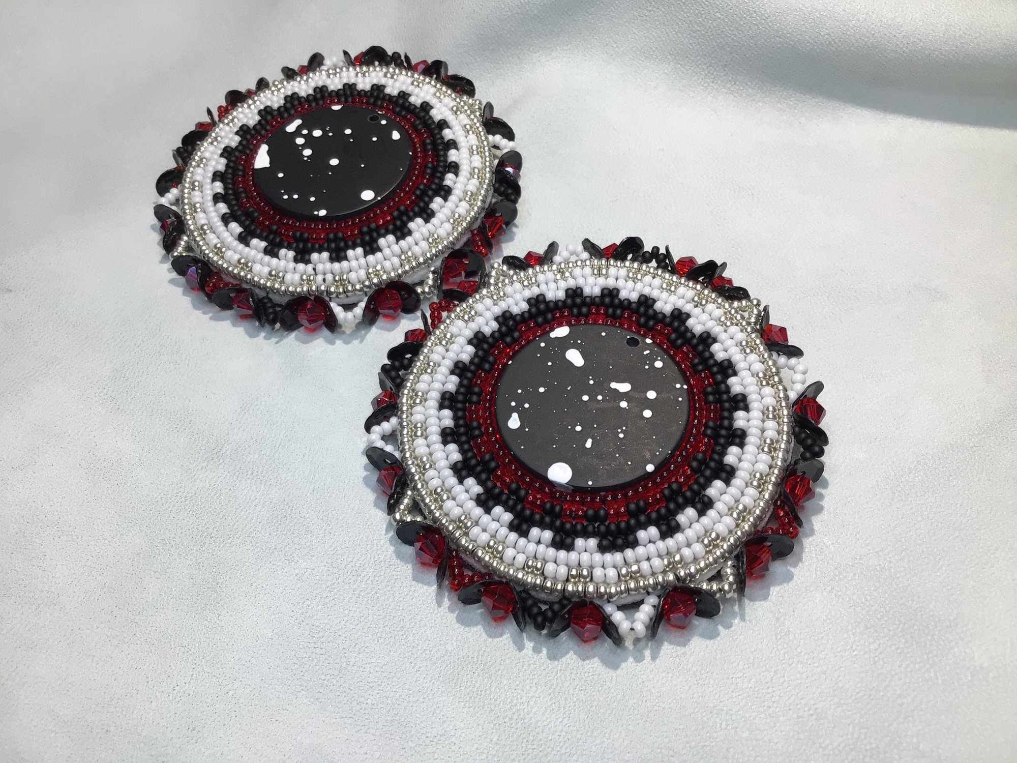 ❗️Was $45, Now $40❗️Make a statement with these Native American beaded earrings-BIG, Bold, and Elegant! Measuring at 2 1/2 inches, they’re handcrafted with black, red, white, and silver 11/0 seed beads. The matte black center bead features a white paint splatter design, adding a modern edge. Finished with black faux leather backing and silver posts, these earrings are both durable and stylish. If you love standout jewelry, this eye-catching pair is a must-have for your collection!