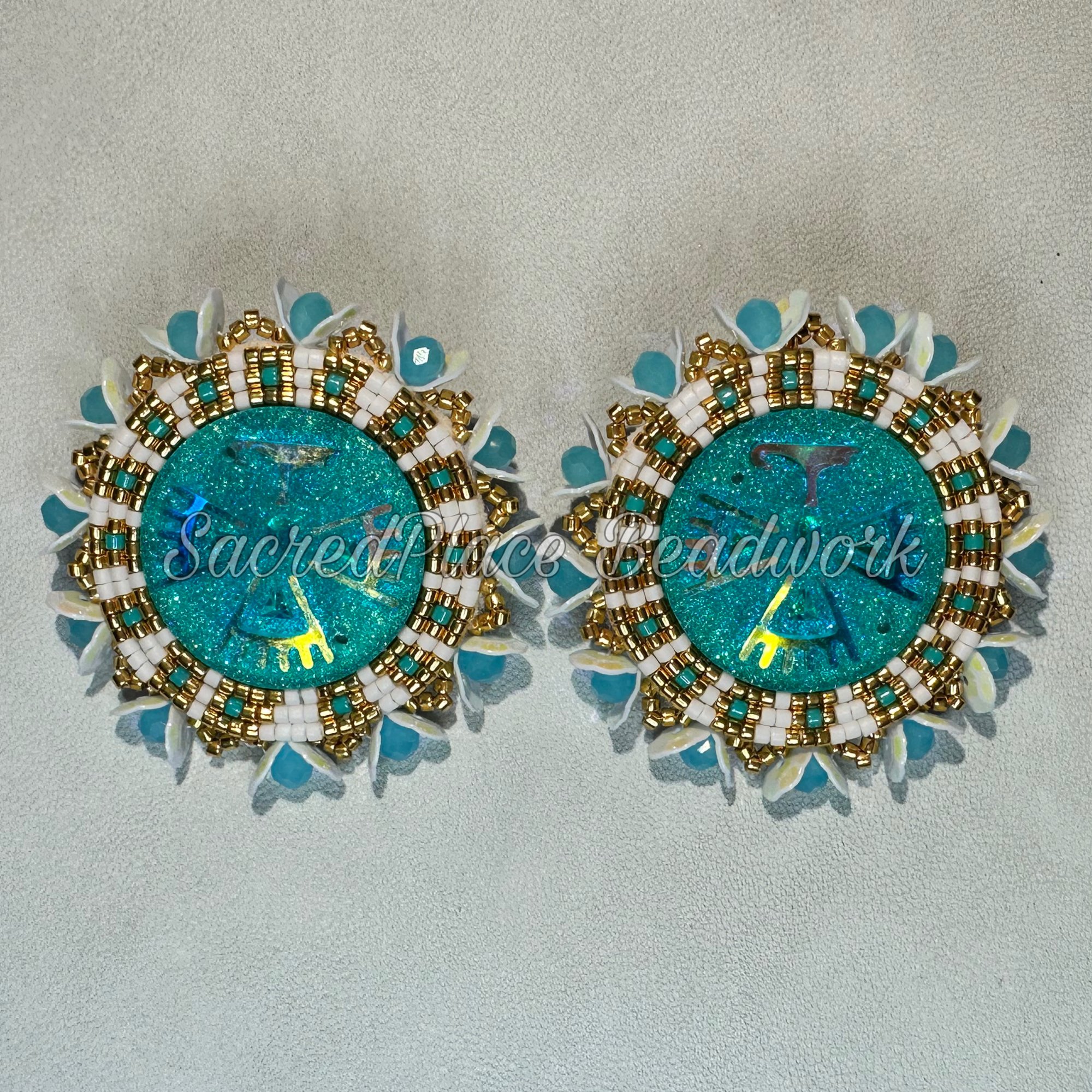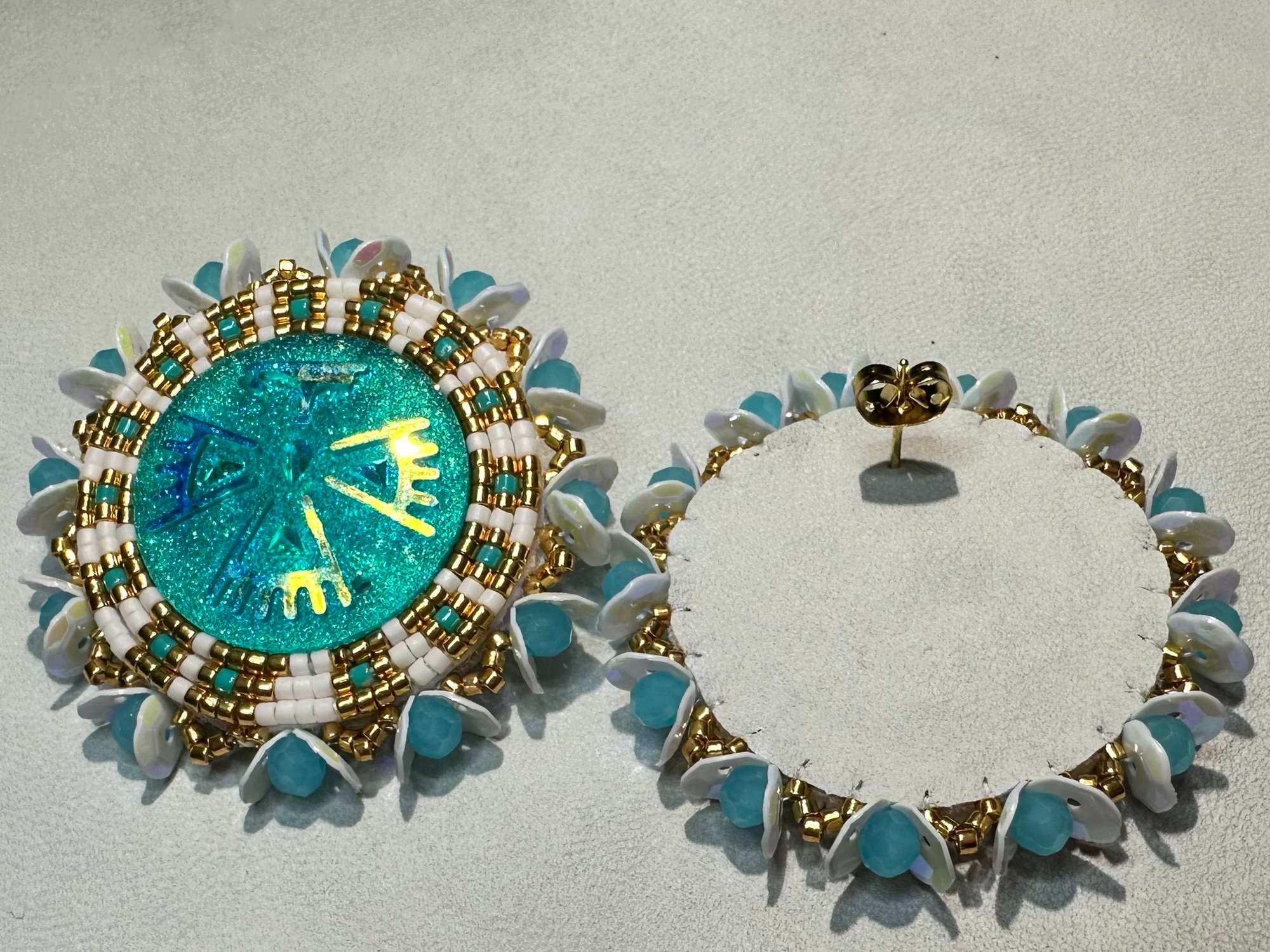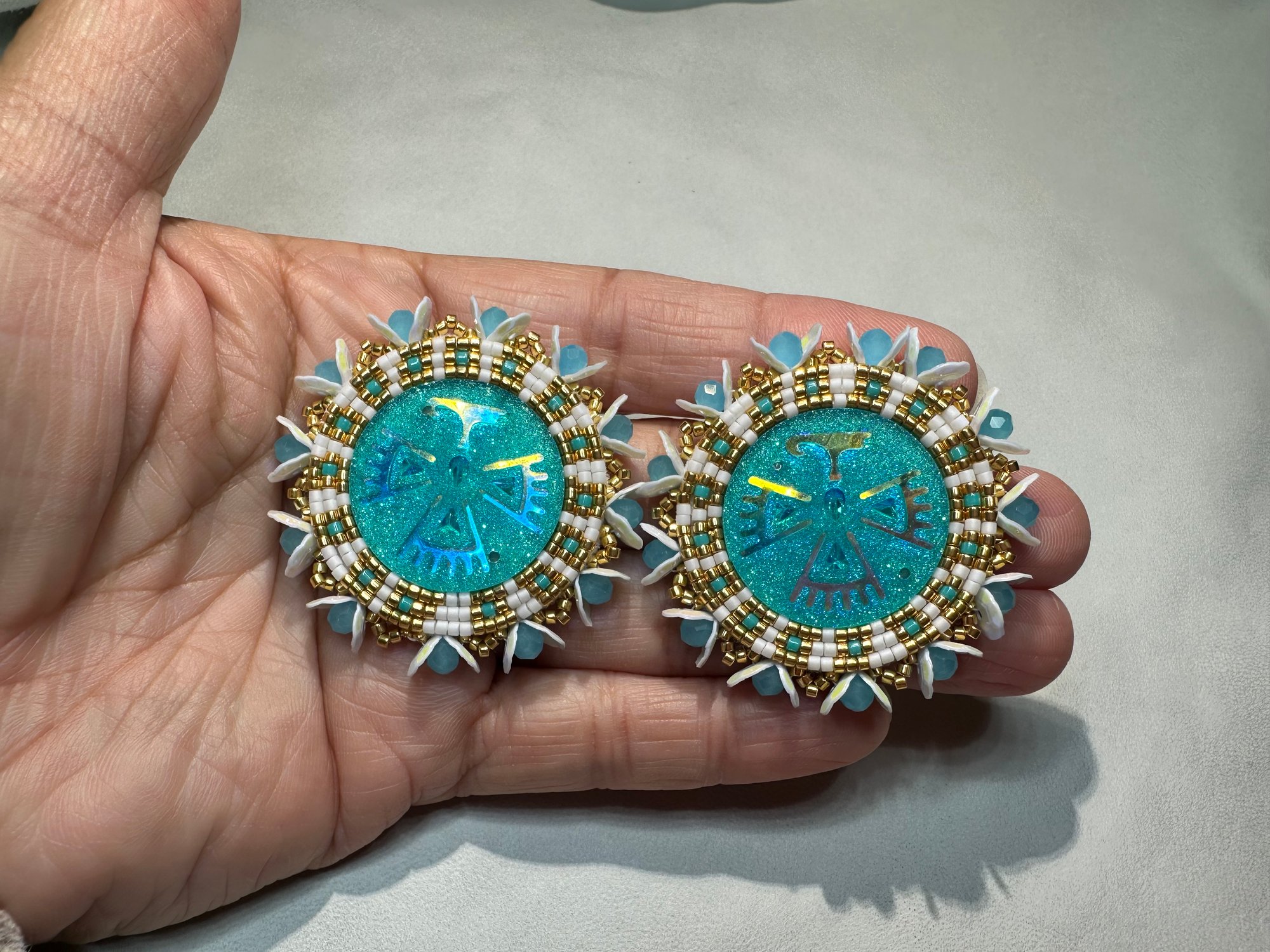 These Native American Beaded Earrings measure just under 2 inches and are beautifully crafted with 11/0 Delica seed beads. Each earring is edged with shimmering faceted beads and sequins, adding the perfect touch of sparkle. The white leather backing and gold posts provide a refined, elegant finish. Add these stunning earrings to your jewelry collection today!